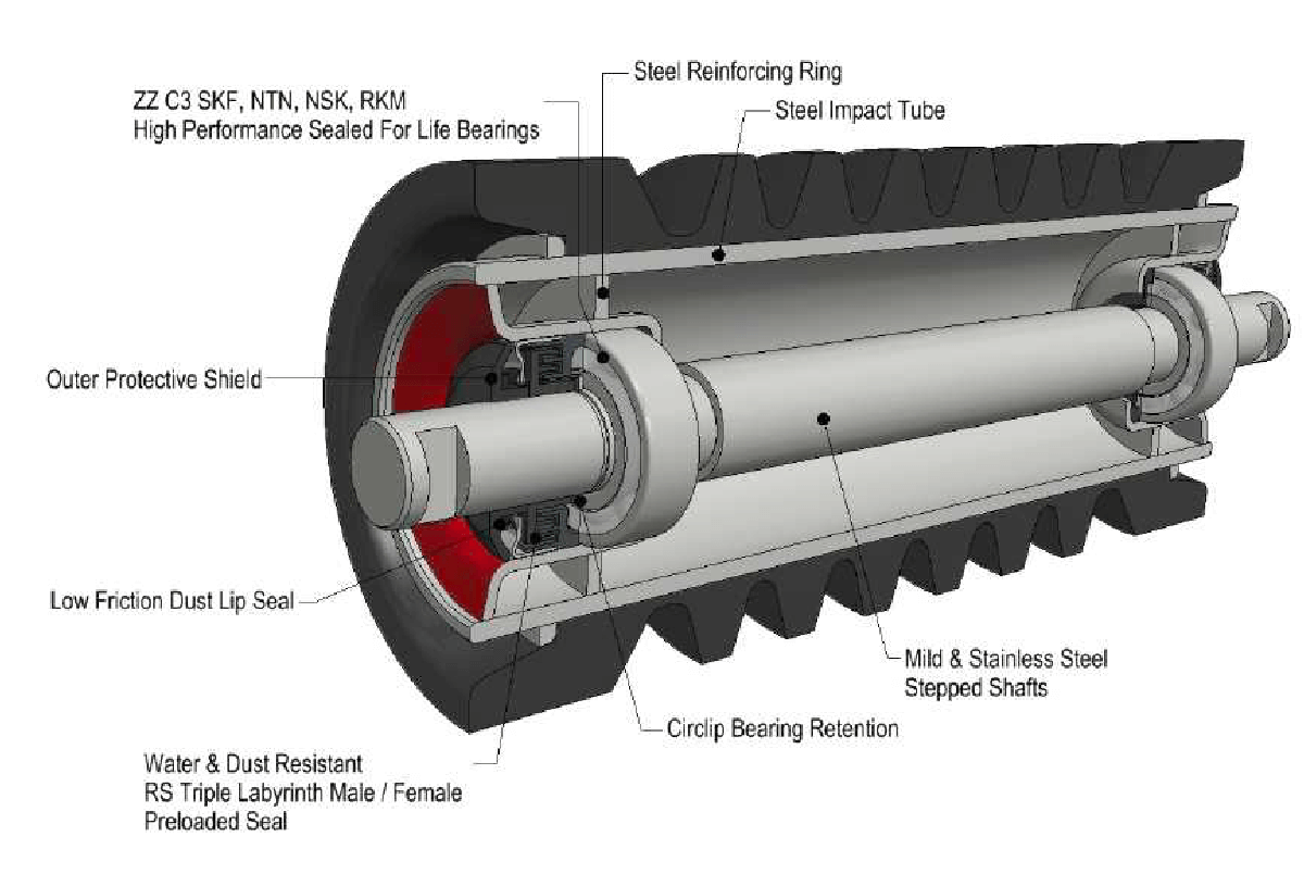 - Rubber impact rings that comes in sections, upon which they are press fitted onto our steel rollers and locked in place using retainer rings.
